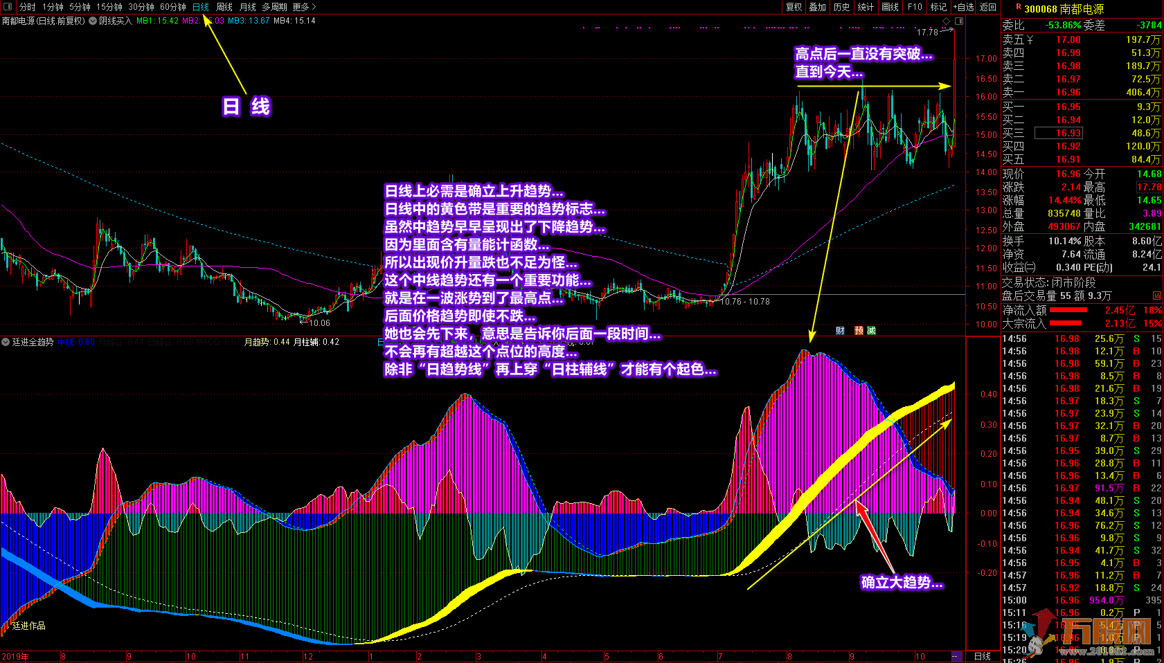 长春高新不能跟了...首先它已到了高位,月线和季线拐头向下。未来趋势目前在高位上是不好判断的。所以看到危险就暂且等一下吧。至于你让我再把选股范围缩小,方法是很多的,不可能让我给你一一讲来。比如我跟踪或买入一支个股首先要看的跟你前面讲的几个基本面和财务参数。再下来就要看题材,打开最近热门板块,看哪些板块的涨幅比较靠前,再结合量能的放量大小、《廷进全趋势》的指标形态等,都可以作为参考内容。比如我刚才讲的 300068南都电源,我是6月19号进的,当时的新能源汽车一直炒的比较好,它是做铅酸电池的。当时《廷进全趋势》指标的“月趋势”一直大于“月柱辅”线。且中趋势的“日趋势线”明显与主图K线趋势背离,再看它60分钟线上,黄带更加明显,且中趋势线也上了中线,筹码也大多位移到了底部。所以,我前面讲过的一些东西要学会去用它,我只能起到“师傅领进门”的作用,修行还主要靠你自己。希望你有时间把我以前的帖子,特别是《廷进简易选股》中的回复和内容看一下,里面有很多我给同学回复的技巧和方法,可能会对你有所帮助,祝进步提高!