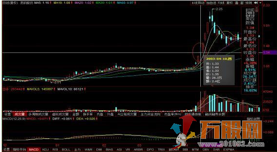 上图是凌钢股份在2003年4月份的走势中,图中的特征就是在4月10日出现了一根带长上影线的星K线,星K线长度超过3%而且成交量呈现的是台阶式的温和放量,显然量价配合的是非常完美,所以我们就可以判断后市必会有拉升。
