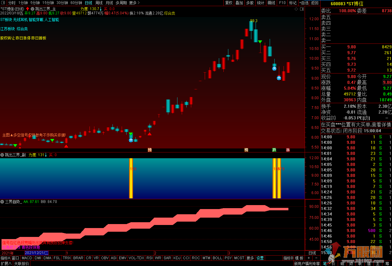 【3】目标股的信号位置处于三界趋势公式的红色操作段的最宽面上一般具有较强支撑!