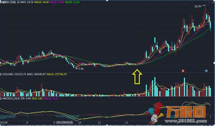 在2021年12月15日,一根中阳线上穿5日、10日、20日、30日四根K线。说明经过一段时间积攒力量后,多方开始发力推升股价,在成交量的配合下,波段最高涨幅101%。