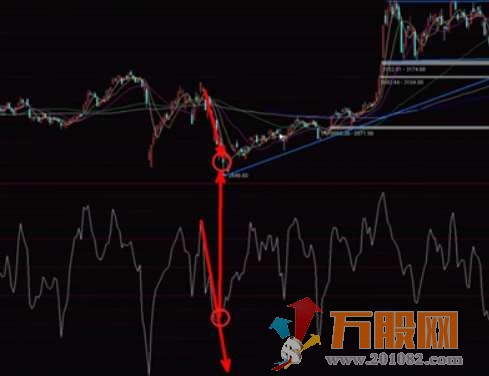 上图中红色箭头这一段走势,是指数在不断创新高,这时候我们反观CCI,它却是完全相反的走势,这就形成了一个顶背离。