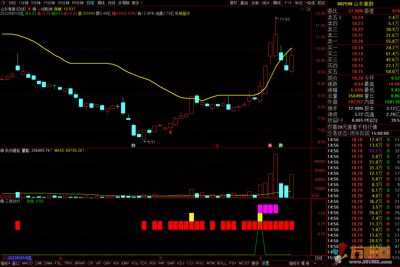 3、机构量能,就是机构的每日的进出持仓情况,那是相当精确的,有时候系统自带成交量,洗盘阴线成交量看上去非常大,其实查看机构量能指标,才知道机构是在四两拨千斤,那就不会恐慌,而会跟机构同步。