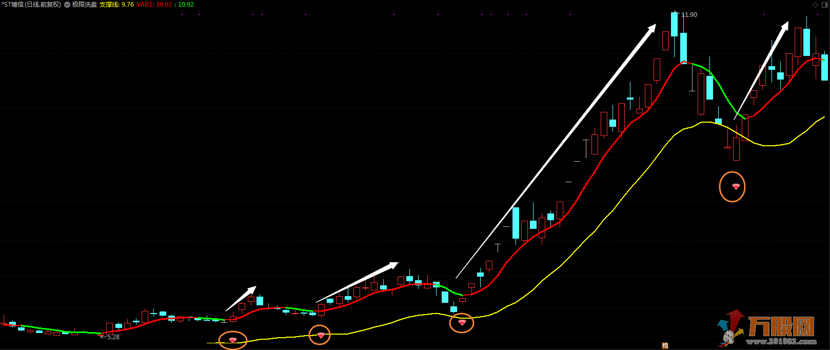 3、那是不是当绿色线段变为红色线段时就是我们的买点呢?答案是非也!我们还要结合出现钻石信号时,决定是否买入。