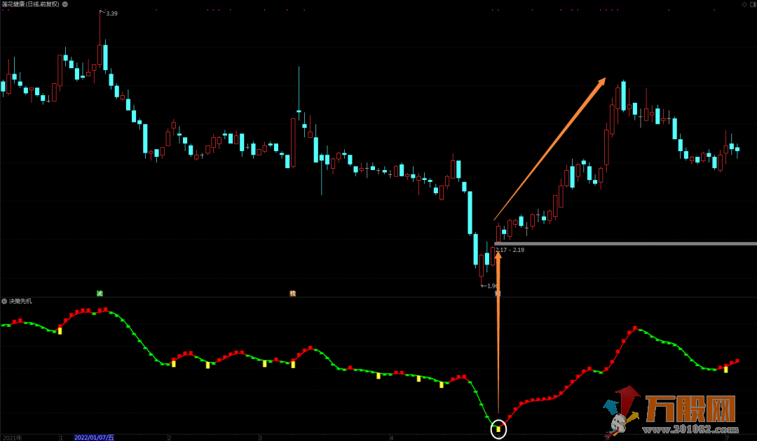 3、当决策线呈蓝色柱体,说明主力资金大举进场,连续的超跌后,随时会启动反弹。