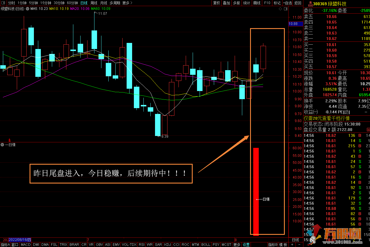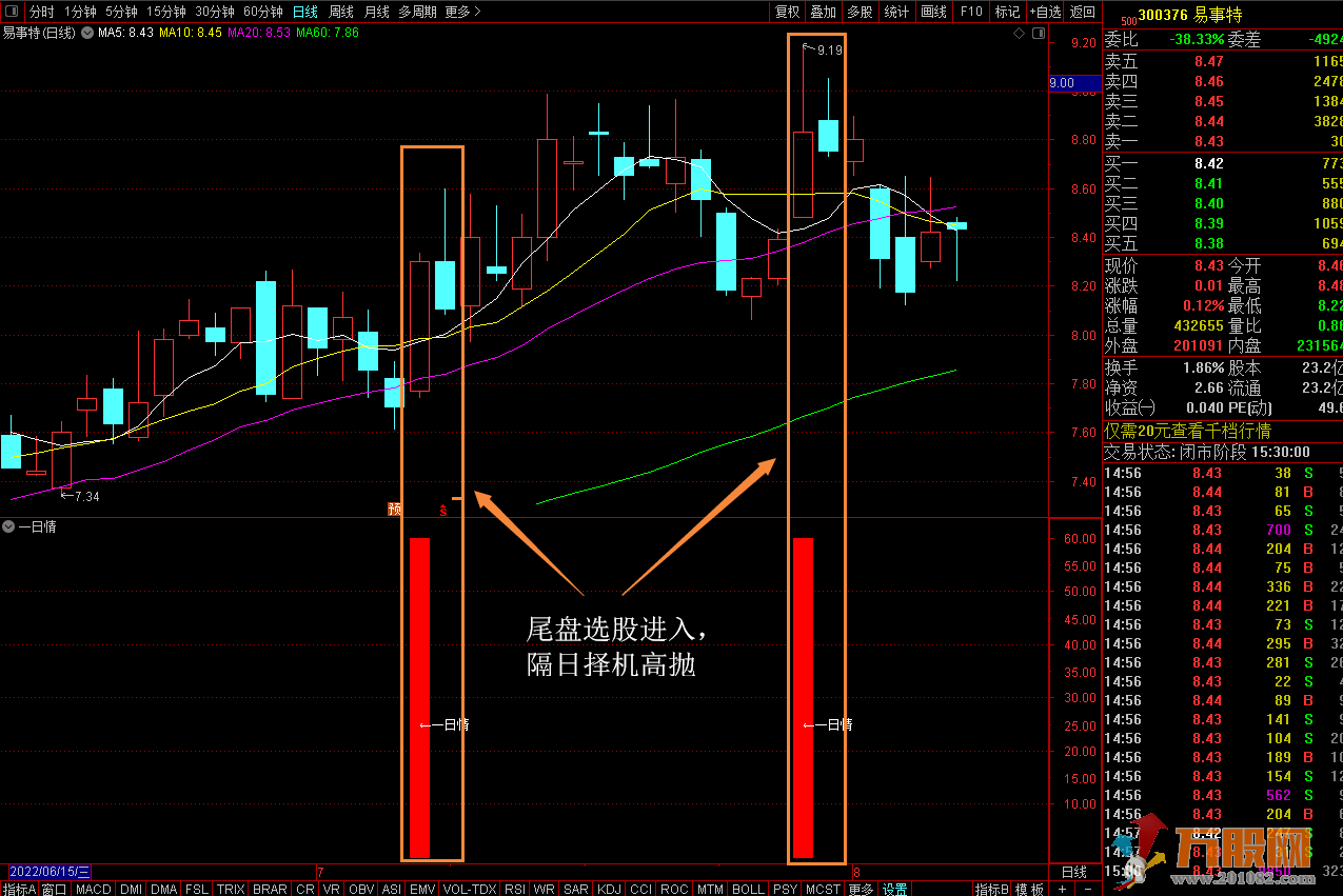 该指标的之所以叫一日情,就是因为指标是做超级短线用的。那么什么是超级短线呢?所谓的超级短线,就是今天买,明天卖,这一类的短线操盘,我们均叫超级短线。指标不含未来函数,大家放心使用,一日情指标成功率还是很高的,2:30后选股买入,第二天10:00前高抛,这点必须执行铁的纪律,不可恋战,有赚就跑。10:00之前若无获利,也必须跑路。大家都知道风险点与收益同在,由于频繁操作,使用一日请指标操盘,仓位不过重,生存第一,发展第二,留得青山在不愁没柴烧。(保本是第一)!