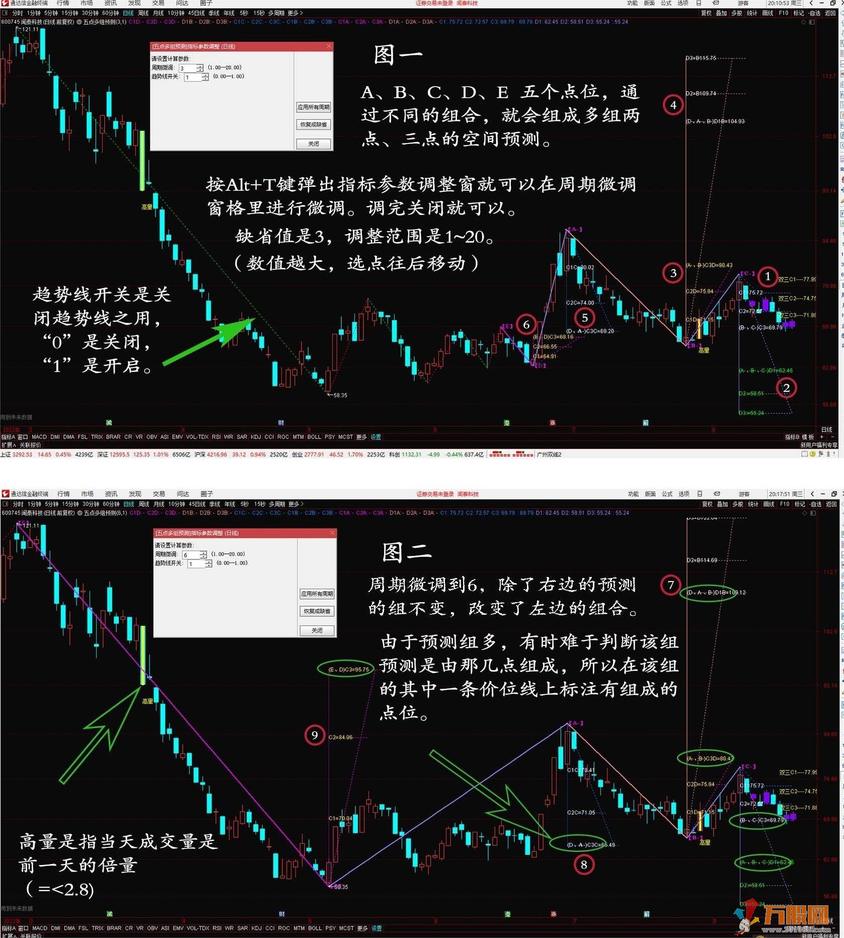 详细用法参看附图一~图六。(有时预测组数多,要知道该组由那几点组成可看该组的其中一条价位线上的标注)