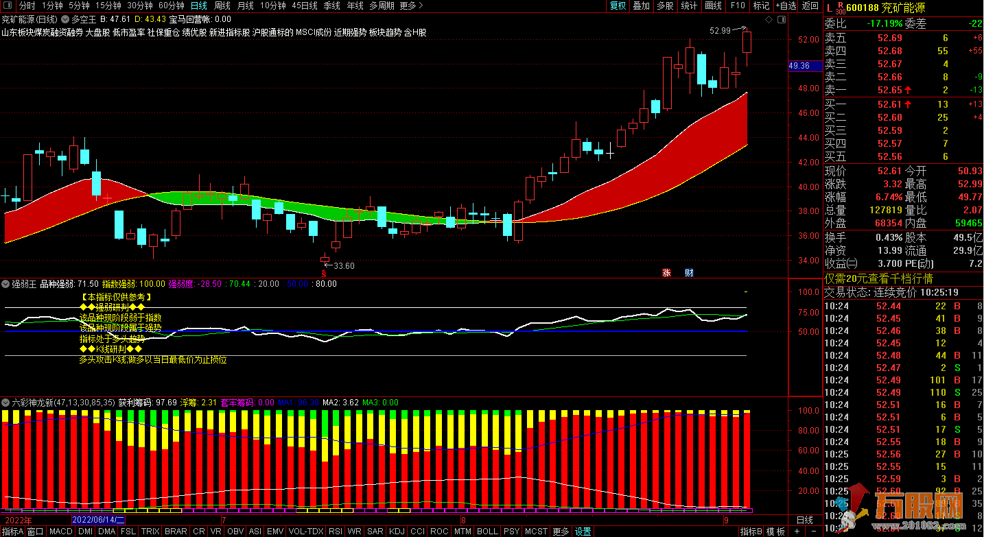六彩神龙(通达信指标)由红色获利盘、黄色浮动筹码和绿色套牢盘,以及三者的10日平均线组成,共六种颜色,故名六彩神龙。