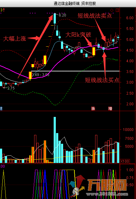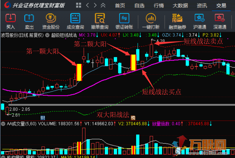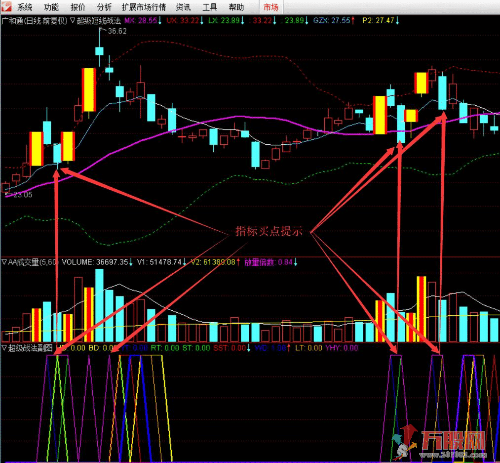 HD是涨停板后基本回调到位提示。 BD是涨停板后小波段的底部提示。 YT是涨停板后的第一天提示。 RT是涨停板后的第二天提示。 ST是涨停板后的第三天提示。 SST是涨停板后的第四天提示。 WT是涨停板后的第五天提示。 L T是涨停板后的第五天提示。 YHY是涨停板后的的微跌提示。 3、筛选指标:名称是超级短线筛股,他的作用是每天或盘中进行选股操作,把大概率符合的股票筛选出来,然后逐一翻看,把符合买点的股票加入自选股板块,这样能减少复盘工作量,缩短复盘时间,根据买点说明定出操作哪只股票,一般最终定下三---五只股票操作,并且,这三---五支股票须是不同的三个板块,以防不同板块的涨跌,切记不能是同板块个股买卖,这样风险最低,但是你认为这个板块就是很强的话就可以是同板块个股。选择股票要结合当前市场的热点强势股,买卖热点强势股的回调股涨幅相应就大(这句话的意思不是让你追强势股买卖,而是让你买卖回调到位的热点强势股)。这个筛选指标的思路是10天内有过涨停板的股票,然后回调到位的股票。一般情况下,大盘震荡时筛股数量在100只左右,大盘好的时候就得是300只左右,咱所操作的符合的股票都在其中,以外的股票就不用看了,这样就大大的缩短了选股时间,每天只需20分钟就能找到目标股票。如果下午想操作股票的话,你就中午筛选一次,每只看一遍,找出下午可能操作的股票即可。具体什么时间买卖见其后的买卖点的说明。 二、超级短线战法的用法讲解 一招必杀。精华中的精华。 跟着热钱走,成功有把握。 1、超级短线双阳战法 超级短线战法是大阳或涨停板回调买入,次日冲高卖出。 双阳是指两颗并列的对称性大阳k线或涨停板k线,并且这两颗大阳k线都是向上穿越蓝线,这两颗k线的高度几乎差不多高,不能差距太大,也就是说k线的高点价格不能相差很多,如下图的第一颗k线和第二颗k线就是所讲的并列性对称大阳k线(此对称K线不是网上所说的双响炮)。 战法中所提及的大阳k线是指涨幅大于7%的k线或涨停板k线。大阳线K线或是涨停板k线最好,涨停板k线最强,中阳线次之。 见下图例 高胜率涨停板超级短线战法系统实战精华作(胜率95%以上)