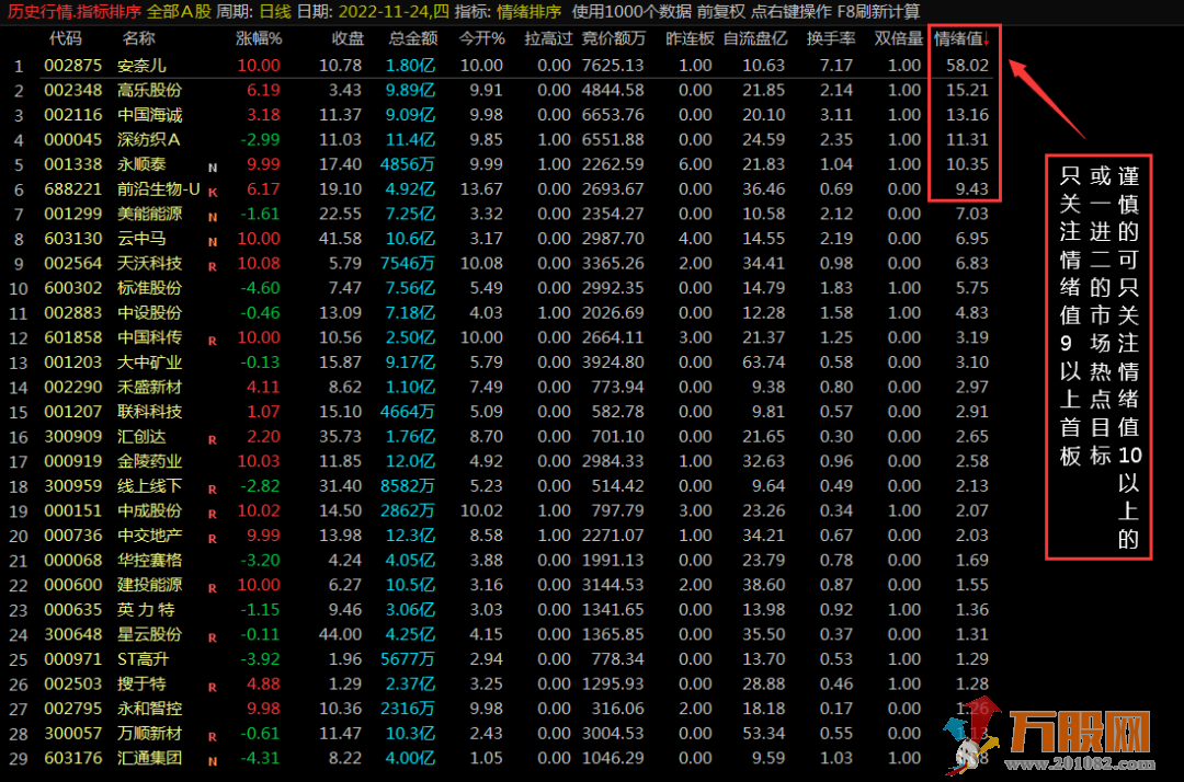 4、重要的事说三遍、只看情绪值就好。(喜欢的可以选择原首板或一进二等其他指标共振排序)。