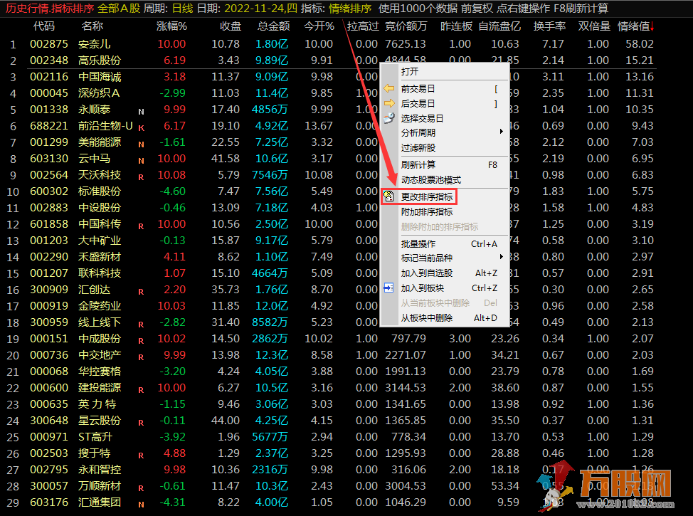1、在键盘右侧计算器上输入.401回车,击右键然后“更改排序指标”,选择“情绪追击”确定。
