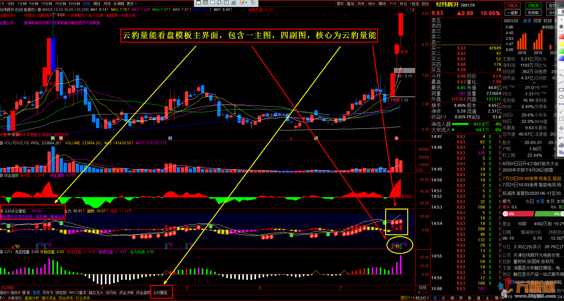 【云豹多空量能】看盘模板已设定好为一主图三副图一选股/预警,其中ZJTJ(副图)为系统自带,也可自行重新设定,预警选股交易日盘中打开即可预警,首次下载好后如需预警选股请下载完整数据,否则影响