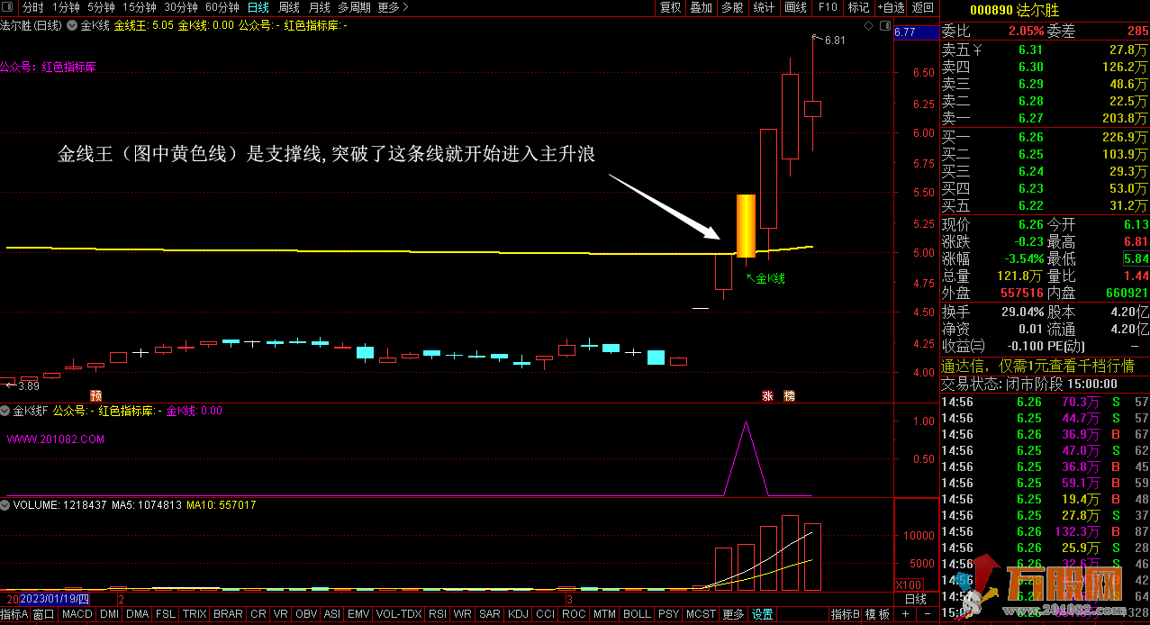 3、金线王(图中黄色线)是支撑线,只要突破了这条线就开始进入主升浪了,我跟踪了很多个股,没有一个大黑马不是从这里 的信号开始的。
