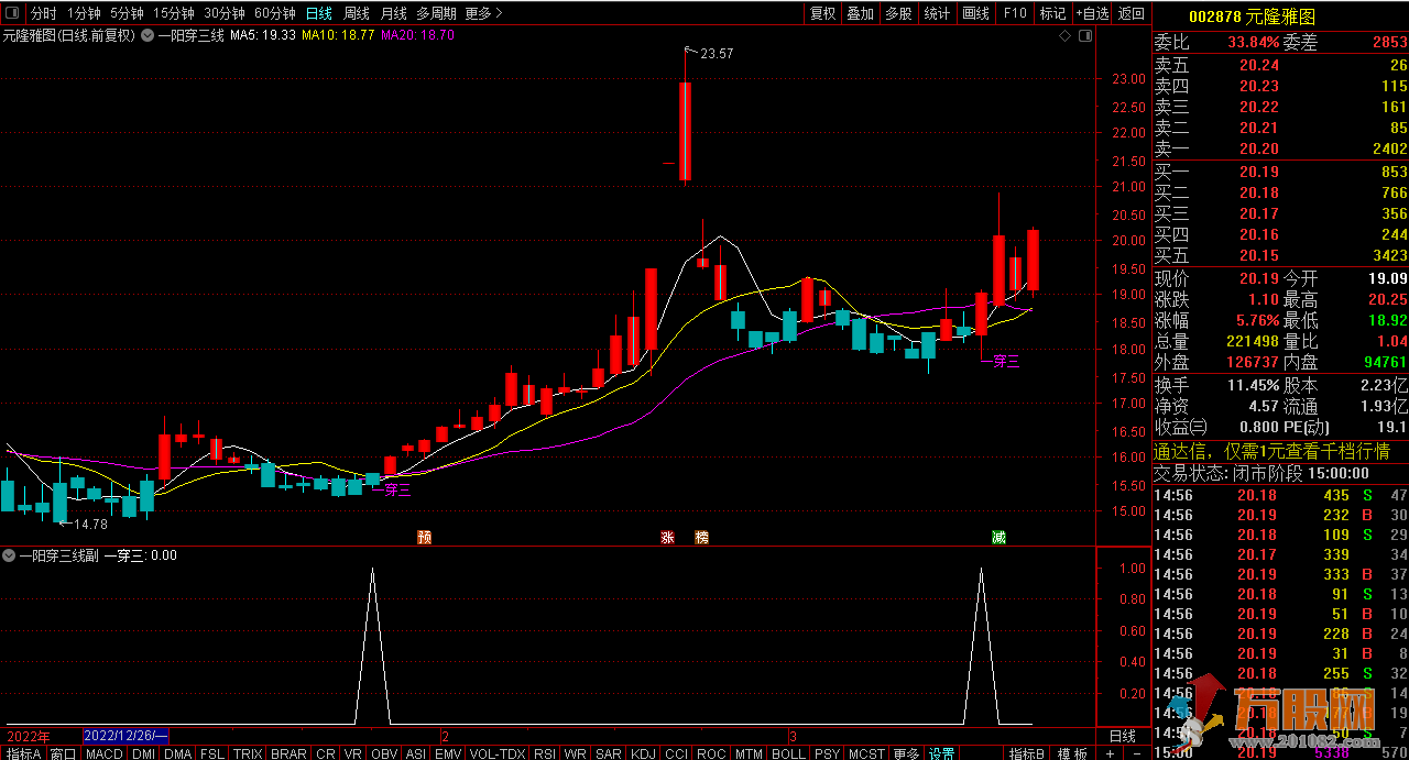 一阳穿三线主要是出现5日、10日、20日均线相邻,并且大阳当天K线穿过三线,回踩5日均线不破,就说明强势行情得到确认。