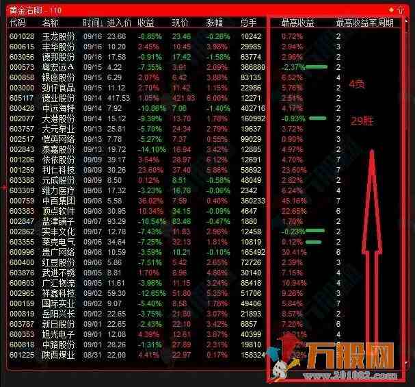 收盘价介入,胜率最高,如果不计持股时间成本,最高胜率可达95.8%。历史数据只代表过去,不代表未来。止赢止损:所有的选股指标都只有买入信号,盈利什么卖都对,止损个人自行决定,每个信号后期走势都不一样,个人操作风格也不一样,根据历史记录,如果不计时间成本,最高胜率可达95.8%。