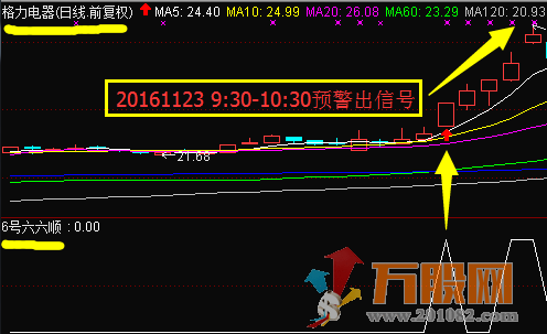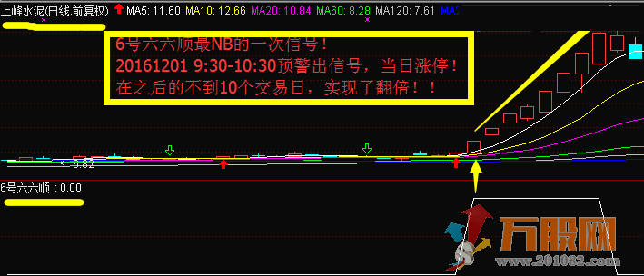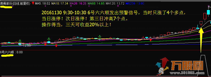 2、【6号六六顺】是盘中抓涨停板的参考工具之一。很多股友一年中都很难得抓到一个涨停板,而【6号六六顺】出预警信号的个股,当日奔涨停的案例不在少数,信号日后出现涨停板的也大有可能。只要预警信号是在10:30前发出的且收盘前信号仍没有消失,即使当日出预警信号后没有涨停,也不会大亏,只要操作得当,信号日后赚的概率比较大。