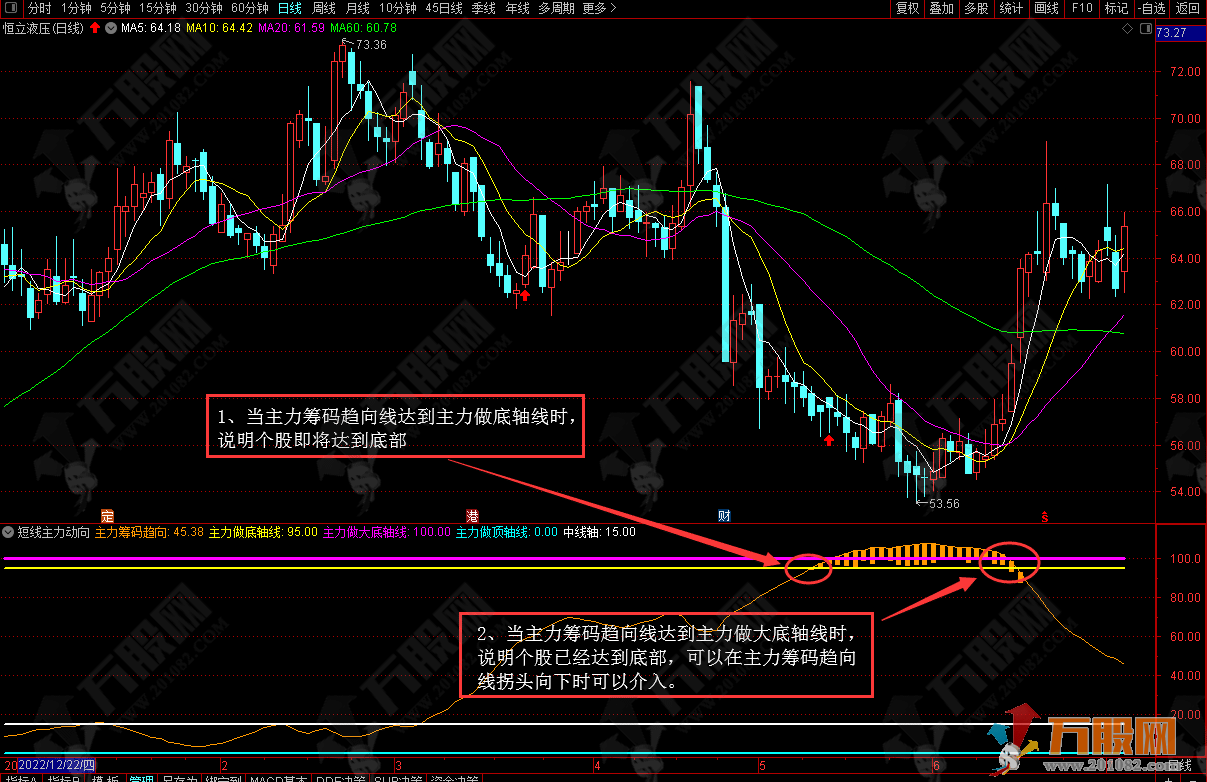 2、当主力筹码趋向线达到主力做底轴线时,说明个股即将达到底部,当主力筹码趋向线达到主力做大底轴线时,说明个股已经达到底部,可以在主力筹码趋向线拐头向下时可以介入。