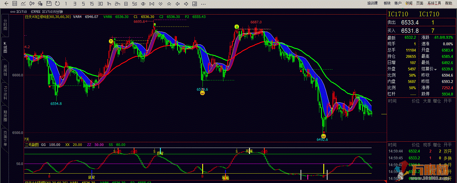 5:往往在一些急速象直线一样拉升或直线下跌中,上升或下降了一波,出现了短暂的停顿,这时分时勾头反转,因为分时是非常敏感的,在停顿勾头处容易出信号,但此时上涨或下跌并未结束,它停了三五分钟后往往还会急速上涨或下跌,所以,这时候在第一次停顿处的信号处开仓,就会失误,有时还会失误很大!遇到这种象接接直线一样的上涨或下跌时,出信号时可先别急于开仓,可先观察几分钟,等其底部开始抬高时再开仓!因为这个高低点是否出现反转谁也无法提前知道!