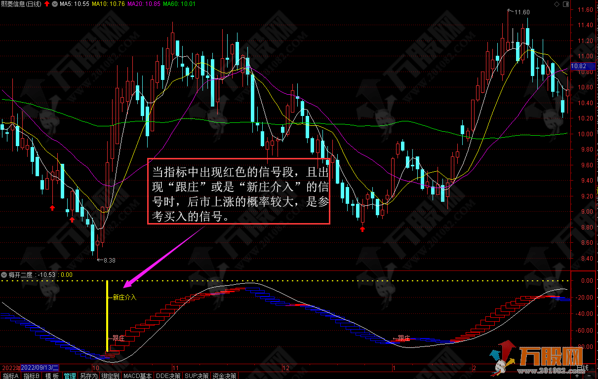 当指标中出现红色的信号段,且出现“跟庄”或是“新庄介入”的信号时,后市上涨的概率较大,是参考买入的信号。