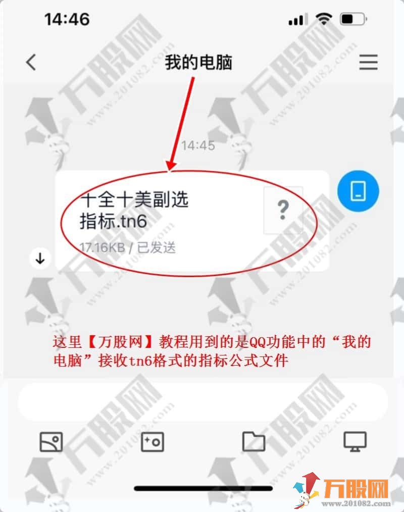 】教程用到的是QQ功能中的“我的电脑”接收tn6格式的指标公式文件。如下图所示: