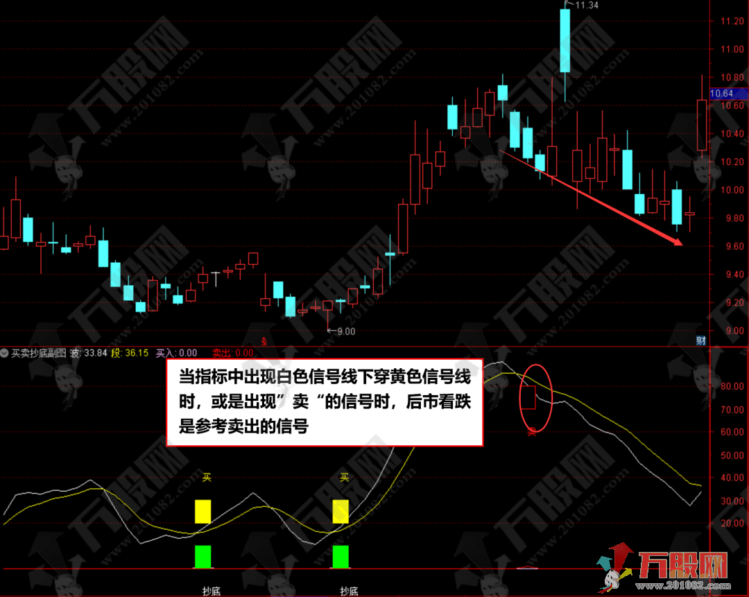 当指标中出现白色信号线下穿黄色信号线时,或是出现”卖“的信号时,后市看跌是参考卖出的信号。