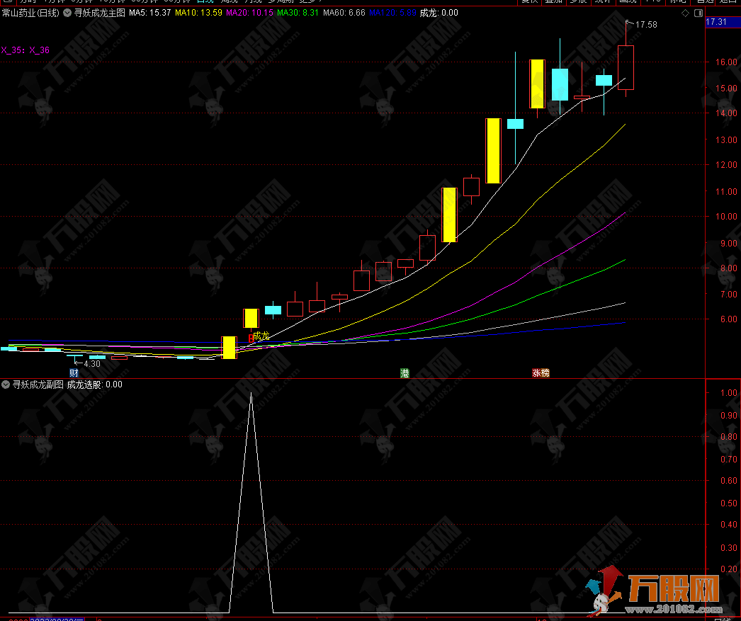 4、主图中黄色柱子上的“成龙”信号,是妖股突破的绝佳买入点。