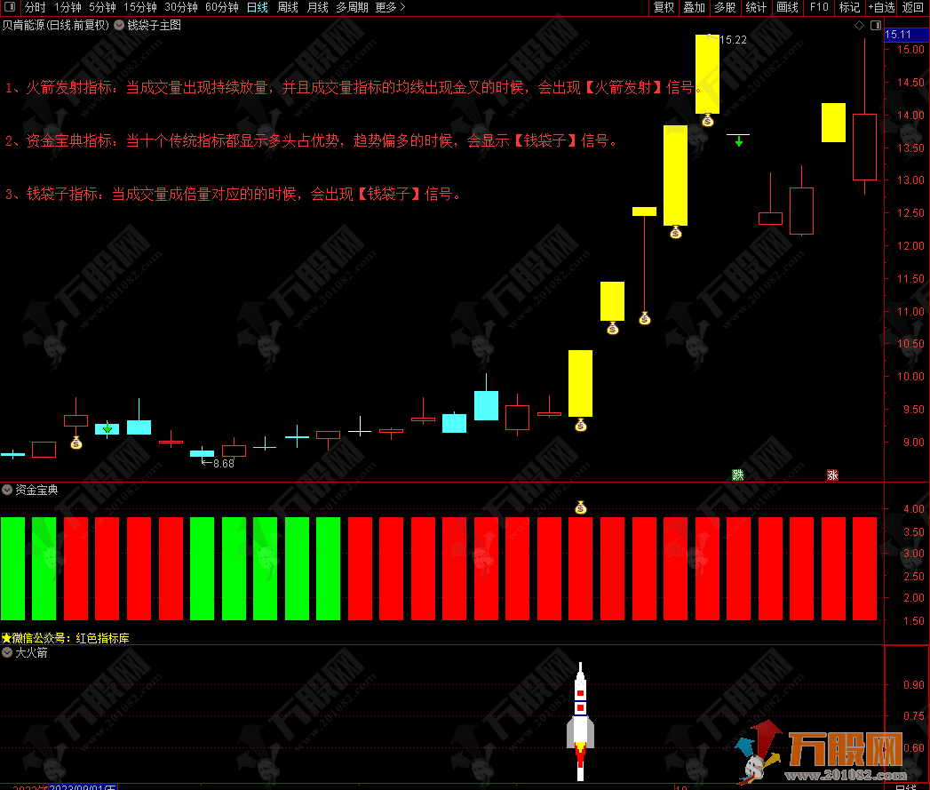 1、钱袋子指标:当成交量成倍量对应的的时候,会出现【钱袋子】信号。