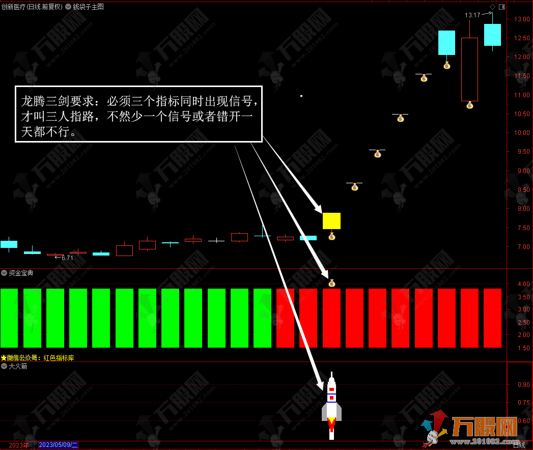 4、龙腾三剑要求:必须三个指标同时出现信号,才叫三人指路,不然少一个信号或者错开一天都不行。