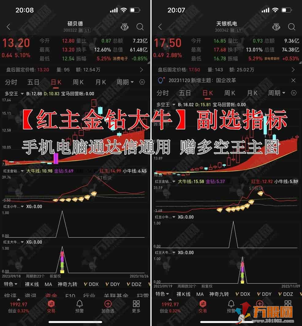 【红主金钻大牛】提供三个副图,两个选股公式,另外赠送一个【多空王主图】看趋势必备指标,检测无未来函数,手机电脑通达信通用,信号仅供参考!