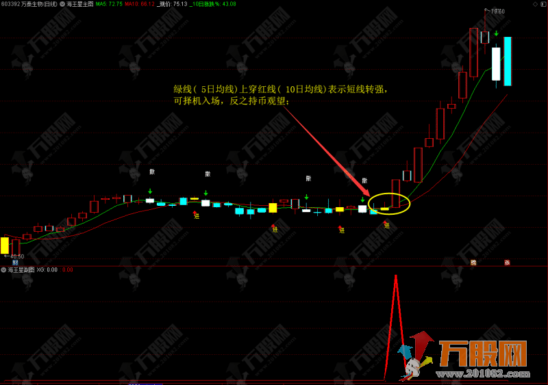 2、绿线( 5日均线)上穿红线( 10日均线)表示短线转强,可择机入场,反之持币观望;