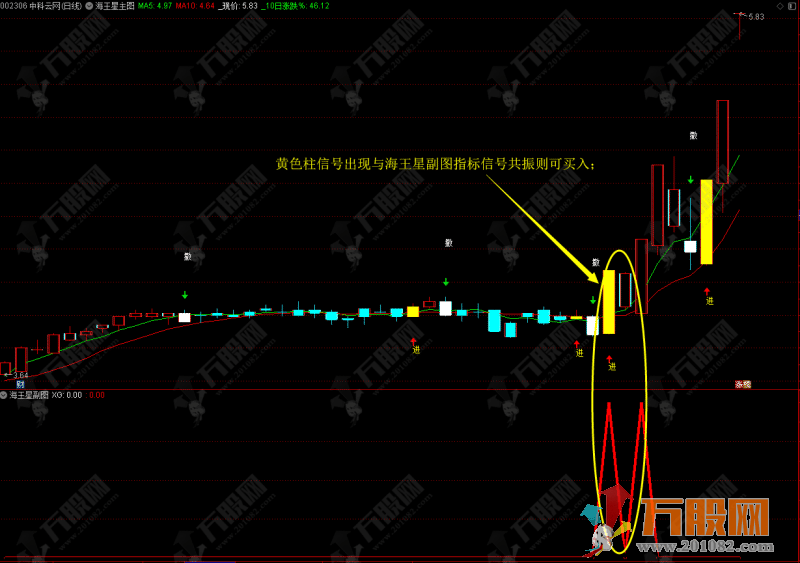 3.、买点一: 黄色柱信号出现与海王星副图指标信号共振则可买入;