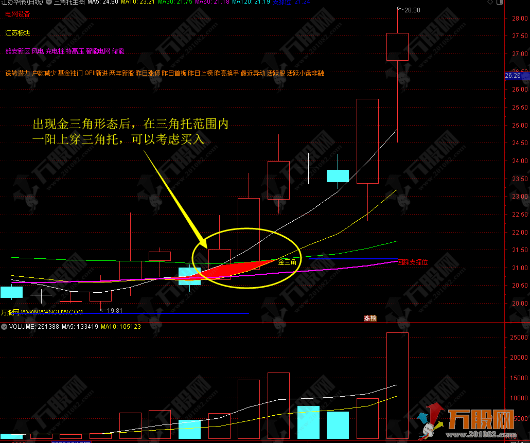 ;经研究发现,在出现金银三角附近,60均线呈水平一段时间(大于5日)时,容易出现超级牛股启动!此时,该60均线水平段与回踩支撑位蓝色线