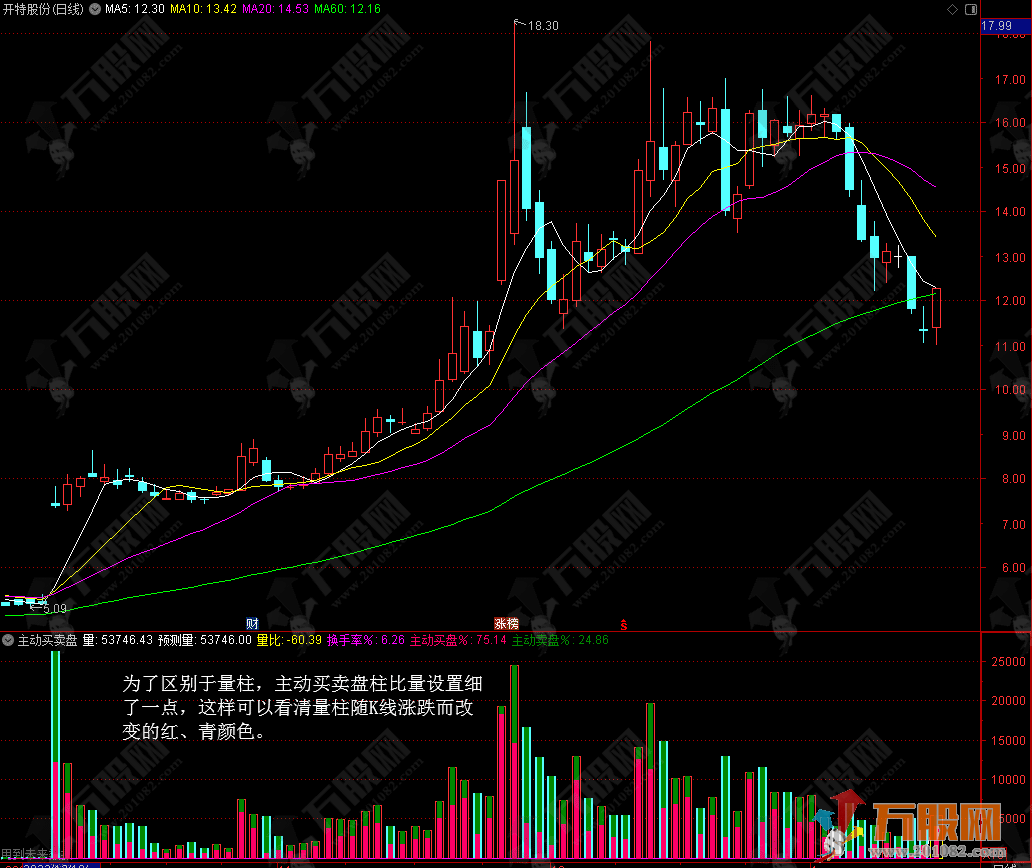 主动买卖盘以百分比显示彩柱,淡洋红色为主动买盘,深绿色为主动卖盘,也就是以深绿色为背景,以淡洋红色从下往上覆盖来显示比例。为了区别于量柱,主动买卖盘柱比量设置细了一点,这样可以看清量柱随K线涨跌而改变的红、青颜色。