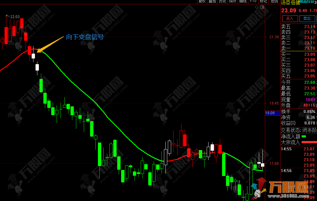 卖点1:大牛线由红色变成绿色,同时股价跌破大牛线,遇到这种情况需要果断卖出;卖点2:下跌趋势确认后,股价再次反抽大牛线,这个位置是再次离场的机会;如下图: