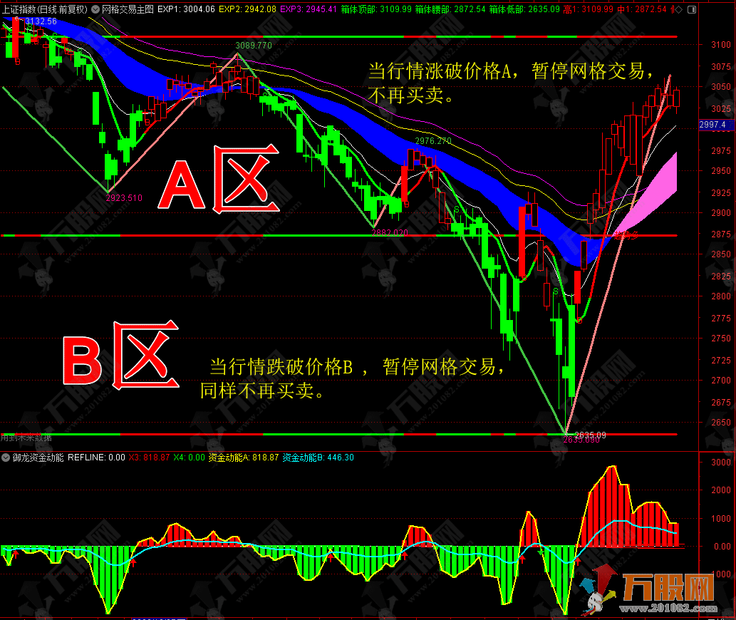 1、当行情涨破价格A区时,暂停网格交易,不再进行买卖操作;