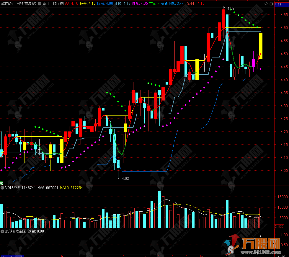 1、AA---类似于均线的5日线的性质,只要收盘不破该数值可一直持有,此线是一条变色线,红色持股,绿色持币