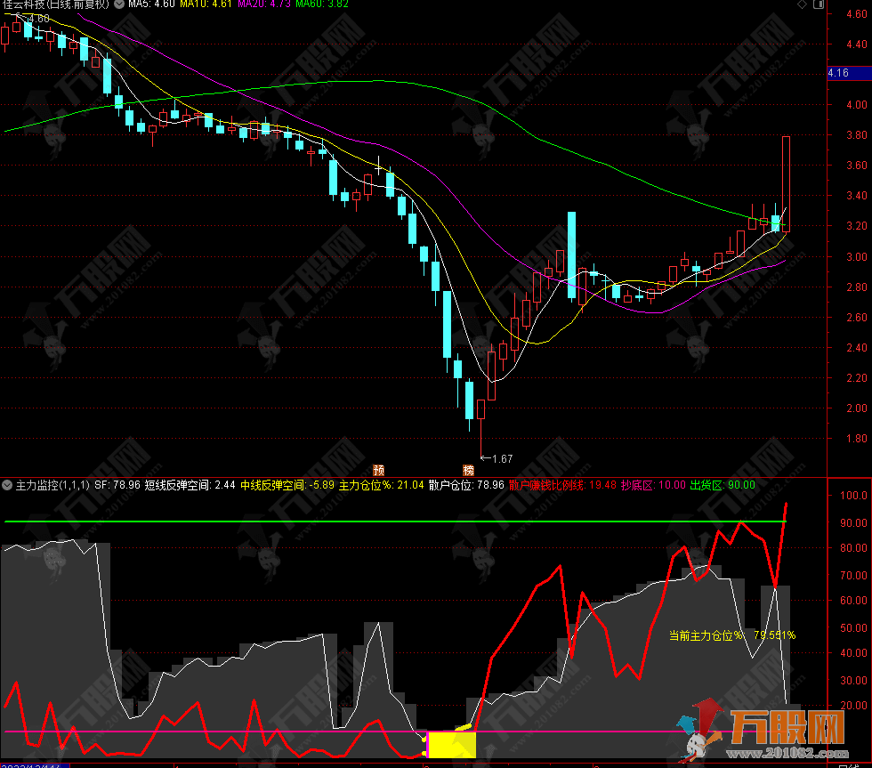 1,主力监控指标主要作用是观察每一个具体个股的筹码分布状况和散户的整体盈利比例。