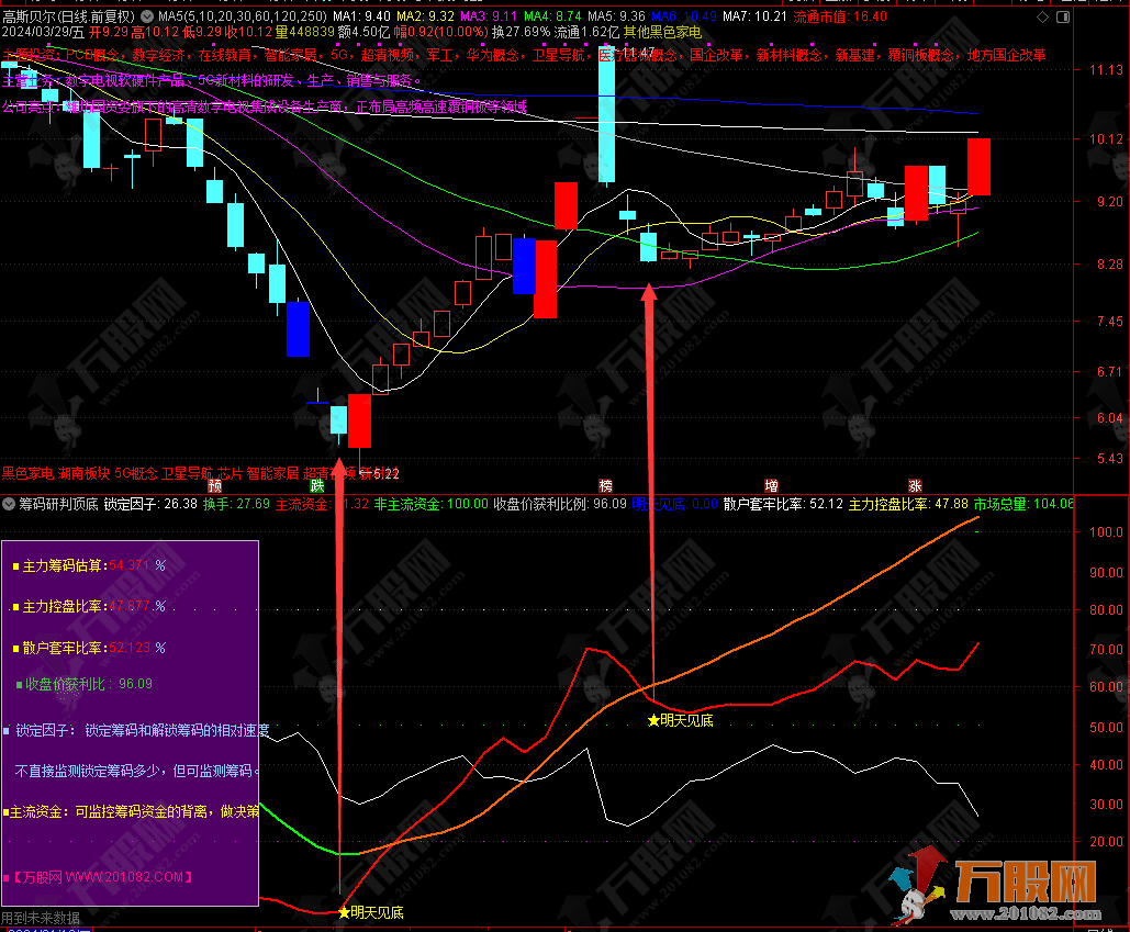 指标监测筹码相对速度,高于50,筹码锁定筹码越来越多,低于50,锁定筹码越来越少. 锥形底,对应阶段顶,一半的机会是在尖底已经上钩后股价才见顶,并不都是需注意灵活运用!