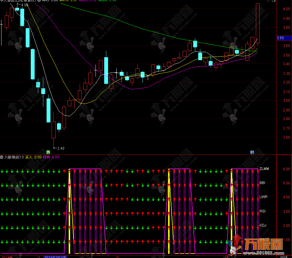 3、六指标同时共振买入时,显示“红箭头”同时向上,并带有“黄柱”买入信号;洋红色覆盖表示可“持有”的天数。