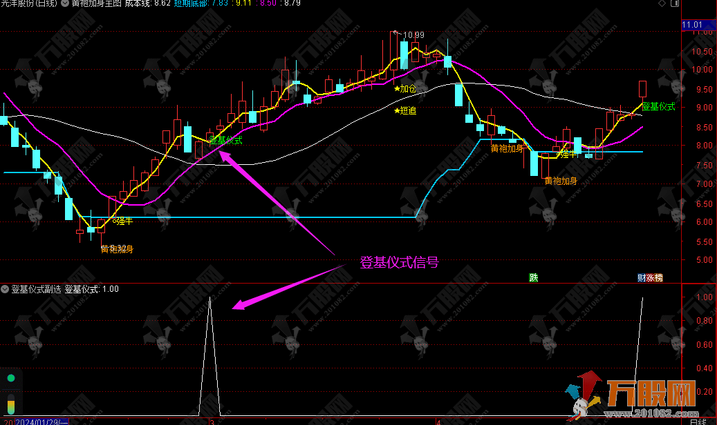 登基仪式这四个字一般不会随便显示,但是一旦显示了,行情就很容易走大涨,出现登基仪式的个股基本都是针对主力低位或者再次建仓的票,这类型的票并不多,但是选出来就非常经典了,另外做了一个强牛和黄袍加身信号,各个都是经典信号,指标不带未来函数。