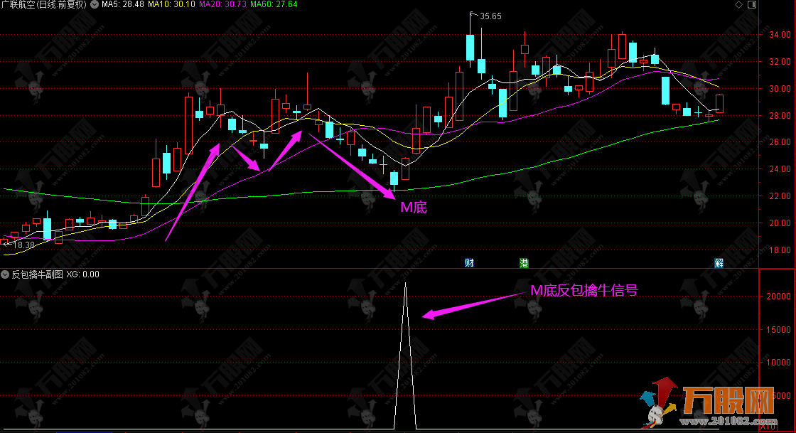 反包擒牛指标是以K线走势形成的一种底部形态,V形底容易擒大牛,M底短线擒小牛,两种形态通常都是抓取下跌反弹机会。
