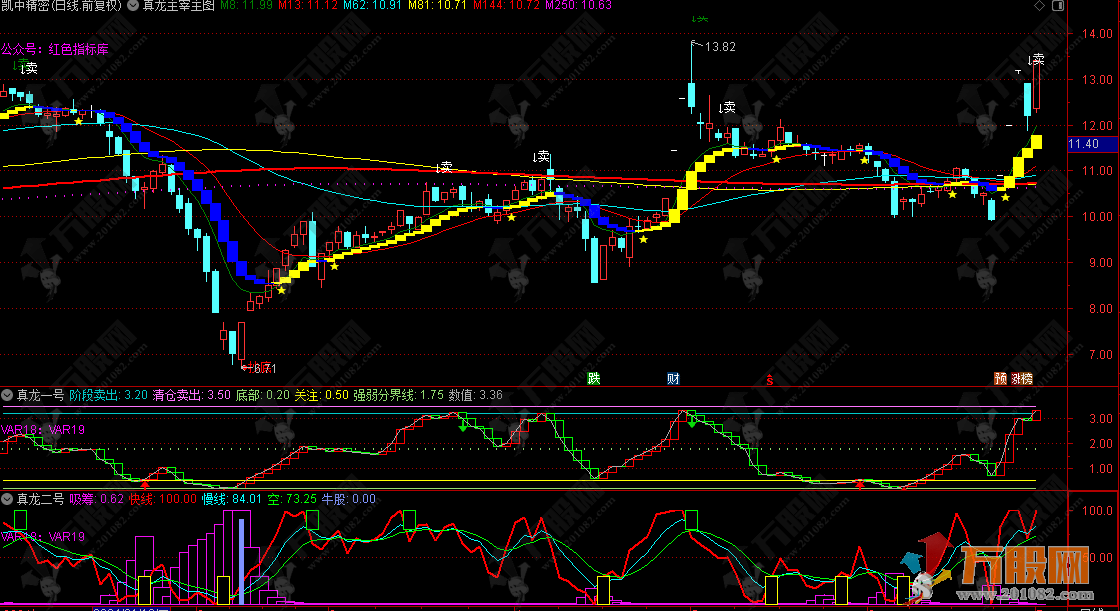 这套战法叫“真龙战法”,包含三个技术指标(1个主图、2个副图),1个选股指标,指标不含未来数据。