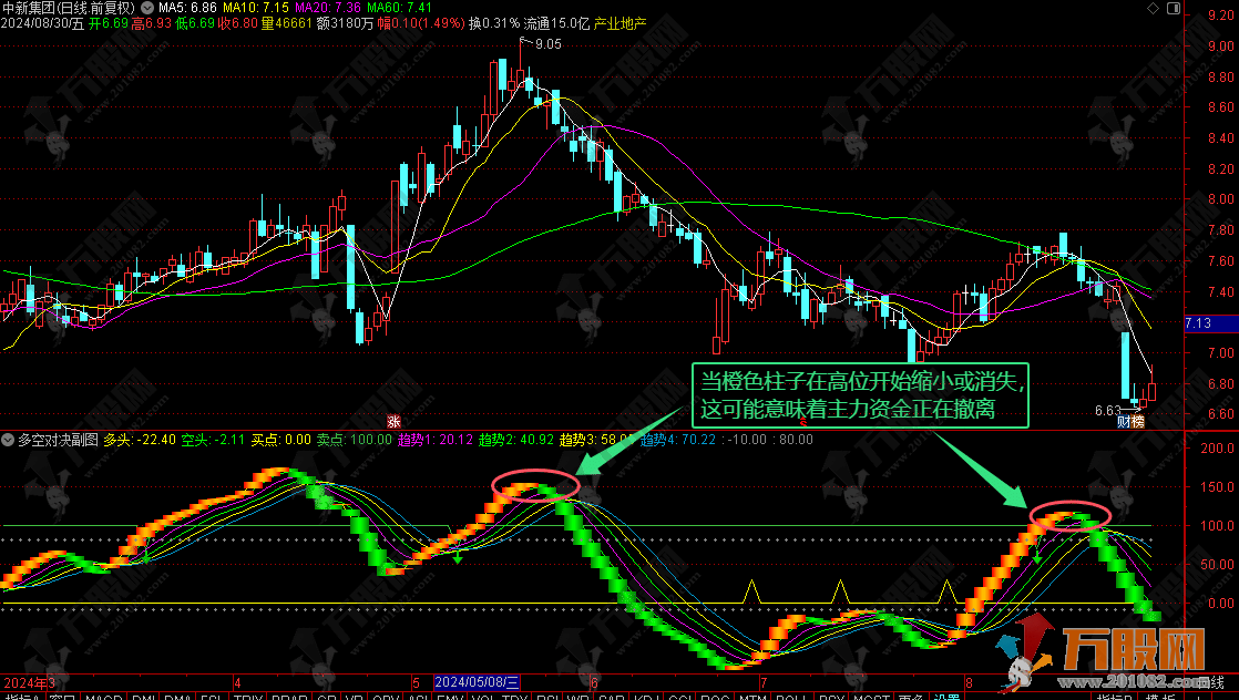 “多空对决”指标的核心在于帮助投资者捕捉主力资金的动向,并通过直观的橙色柱子来表示主力趋势。当橙色柱子出现时,可以跟随主力资金的步伐,寻找合适的时机进行买入或卖出操作。