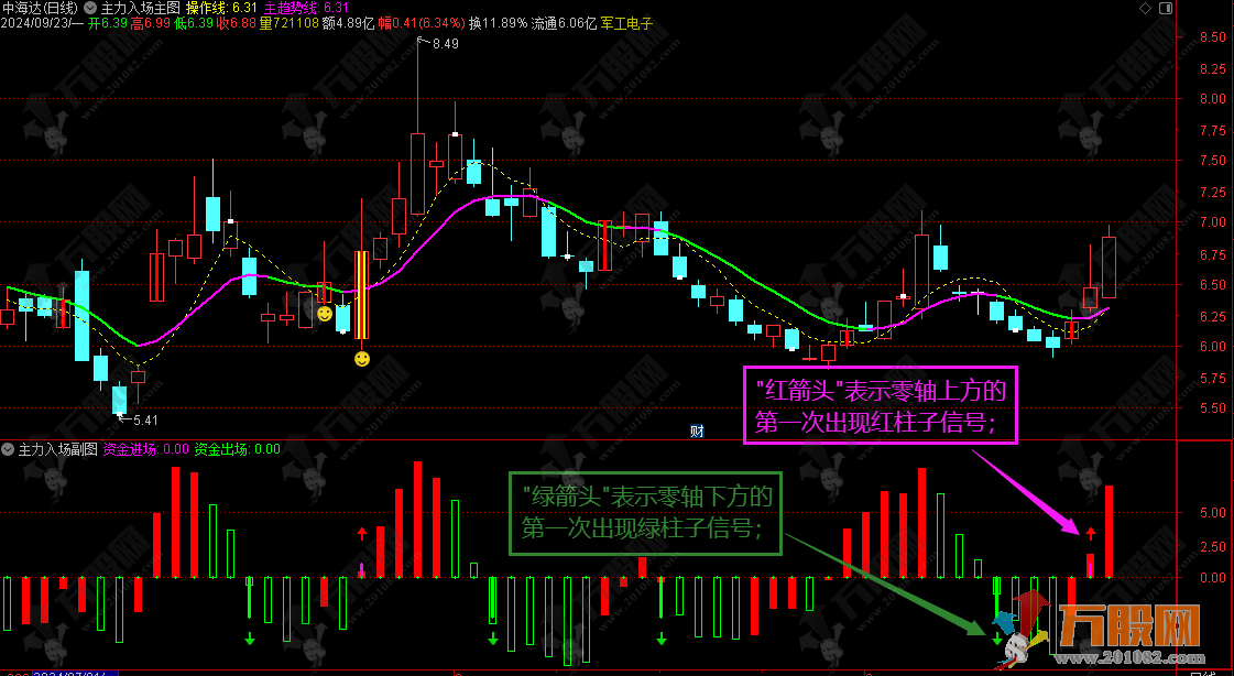 3、"红箭头"表示零轴上方的第一次出现红柱子信号;
