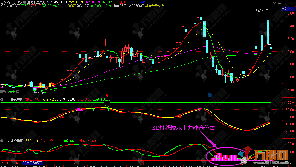 1、主力建仓:3D柱线提示主力建仓位置时段,也就主力吸货提示,样式和参数都经过我精心的调整和美化,整合风险涨跌移动平均线,此指标仅一个主力吸货提示,就足以让大多数散户朋友们立于不败之地了。