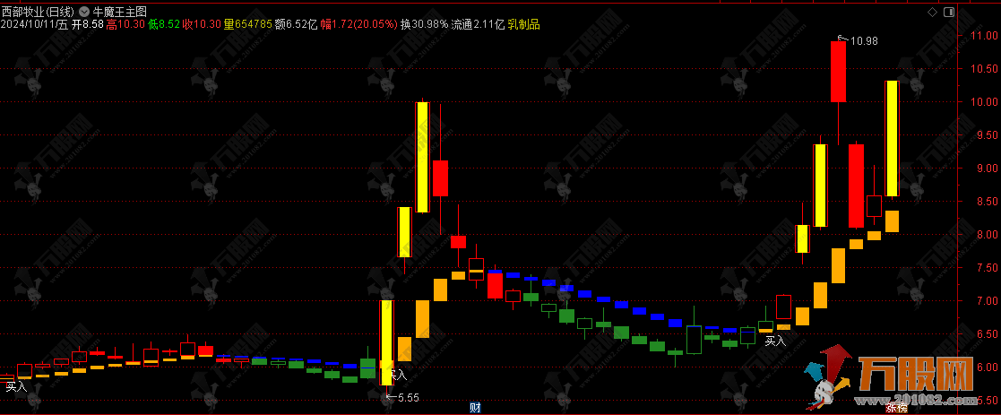 某平台的【牛魔王指标】,每年5位数的使用费,其中主图黄蓝趋势线是多空航标,黄色柱是多头趋势,蓝色柱是空头趋势,主图K线标注,红色K线是多头机会,绿色K线是空头机会。