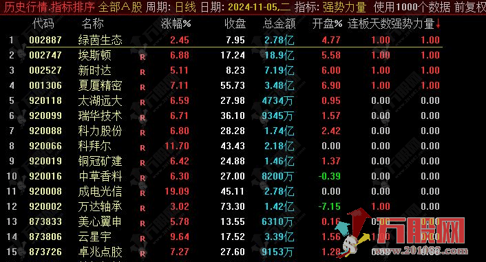 3、在集合竞价期间(9:25~9:30)打开指标排序界面,点击强势力量信号进行降序排列,当强势力量数值为1时,说明符合选股条件。