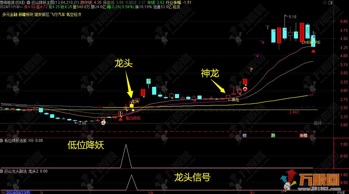 【巡山降妖】量化降妖抓龙,寻龙回头,题材共振,神龙信号,突破前期高点画线,底部低点画线,可做短线指标,趋势,抄底。适合不同风格,主图指标,支持手机电脑使用