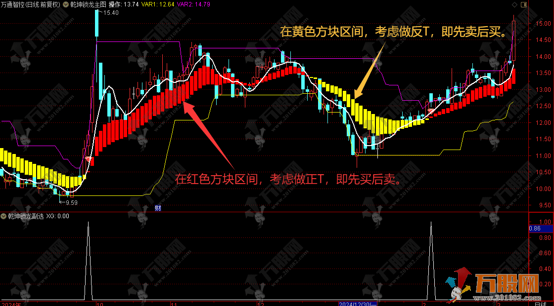 根据红颜色和黄颜色方块区间,决定持股策略和做T的类型。