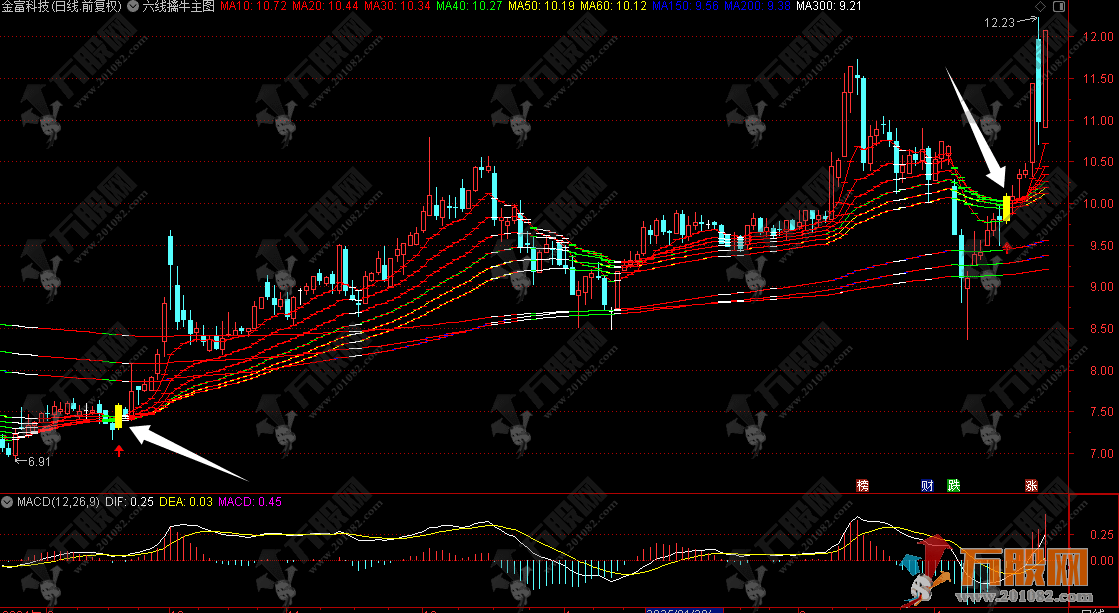 一阳穿六线(黄色K线+箭头图标)表示强势突破信号,可能预示趋势反转