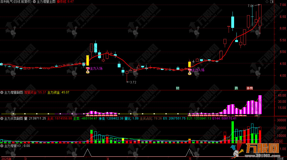 3、紫色柱体(增量资金)与白色柱体(主力资金)同步放大时,副图对应周期量能均线呈多头排列,形成量价共振。